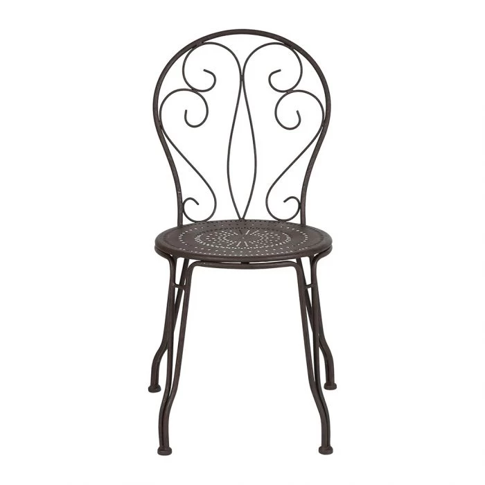 De la collection Charmet voici les chaises réalisées entièrement en métal brun. Assise pleine joliment ajourée et dossier travaillé avec des volutes.