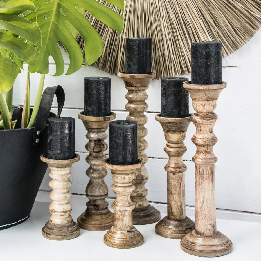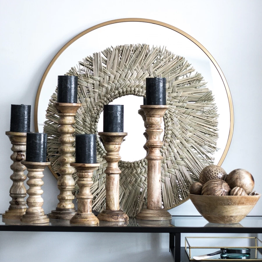 Très joli chandelier entièrement réalisé en bois de manguier, pouvant recevoir une bougie cylindrique ou une bougie ronde.