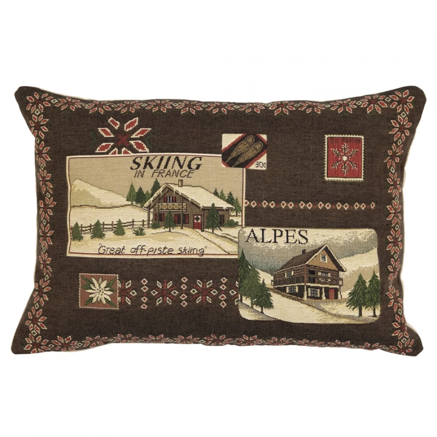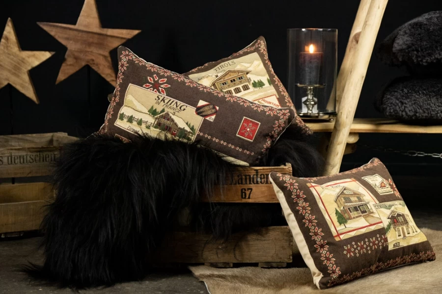 Très chics coussins de la collection Gobelin sur le thème des chalets à la montagne