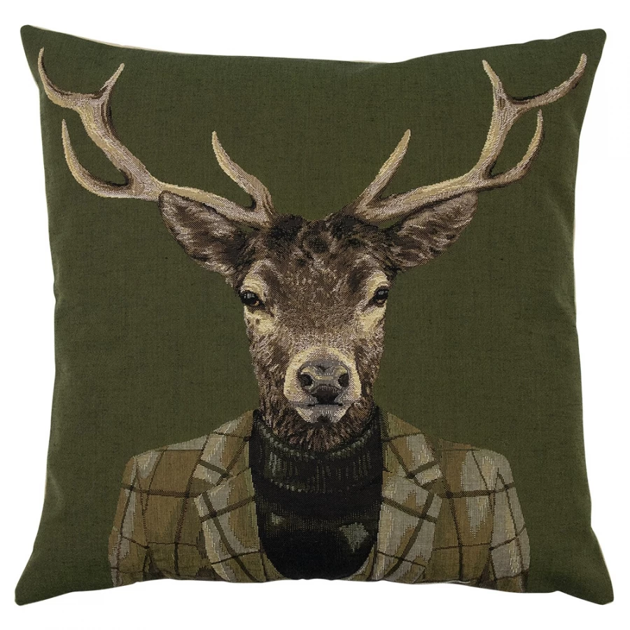 Très chics coussins de la collection Gobelin sur le thème ludique du roi de la forêt dans une tenue de soirée.