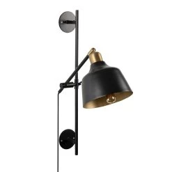 Très chic applique murale en métal noir et doré, monté sur un bras articulé et règlable en hauteur. Cette applique est équipé d’un câble electrique de 1.5m avec intérrupteur à brancher dans une prise électrique standard. Pas besoin d’arrivée éléctrique à hauteur.