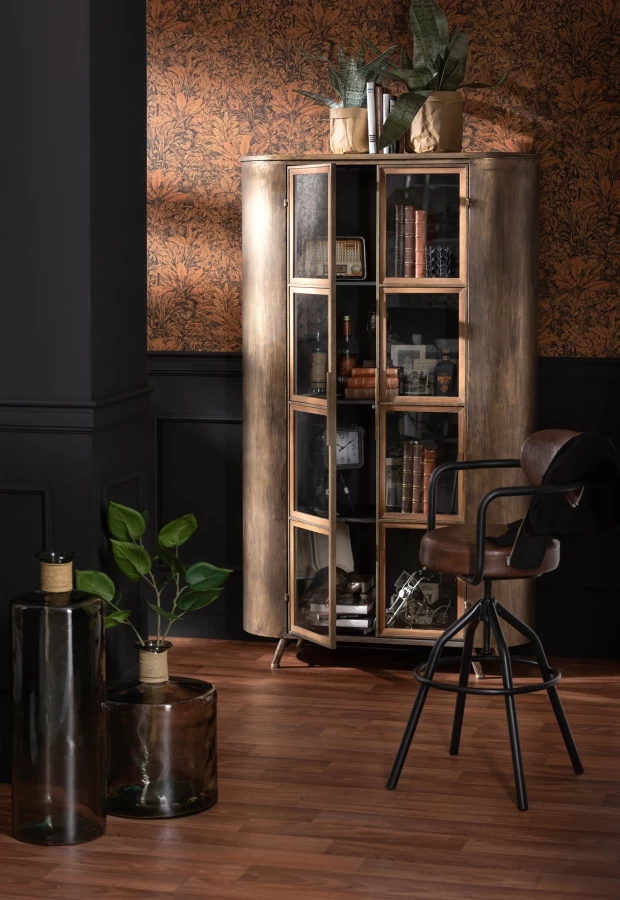 Armoire de style Indus chic, réalisée en entièrement en métal doré viieilli. Cette armoire offre 2 portes vitrées ouvrant sur 3 étagères. Son look lui permet d’être utilisée dans une entrée, un salon, un bureau ou même une salle de bain…