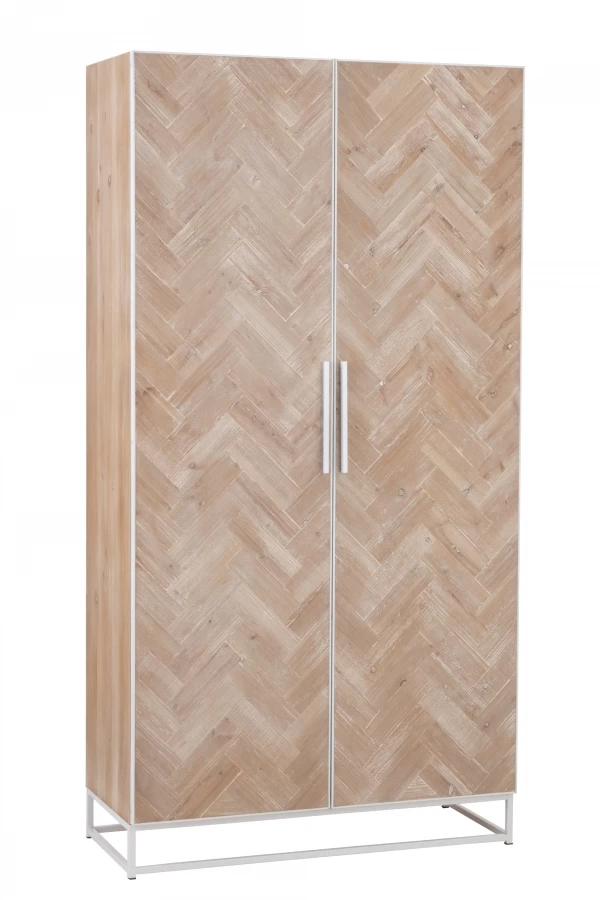 Armoire 2 portes de la collection Zig Zag, réalisée avec un piètement métal habillé d’un meuble en bois. Les dessins du faconnage bois sur les portes donnent le nom Zig Zag à la collection.