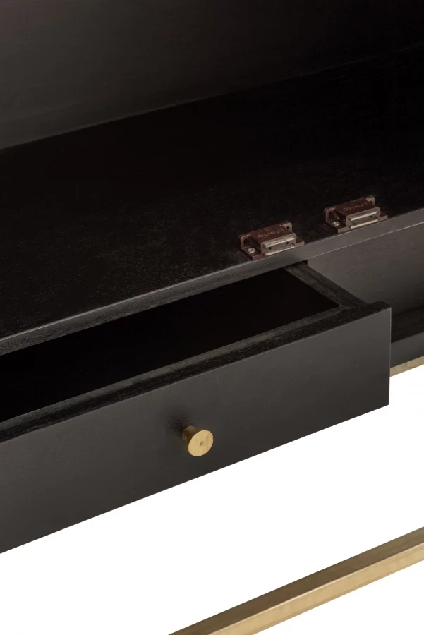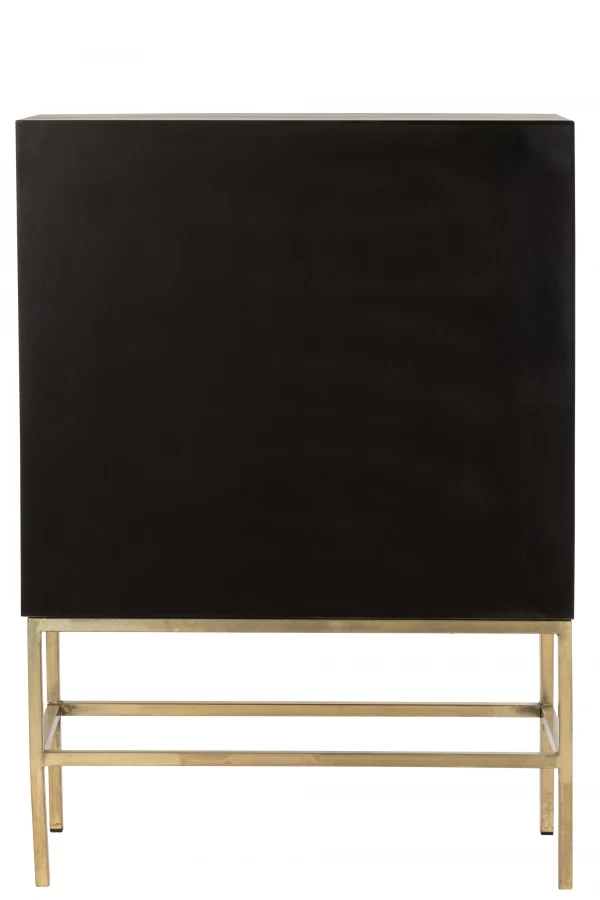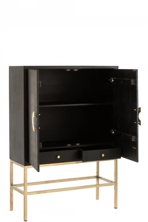 Ce meuble 2 portes poignées or ouvrant sur 1 étagère pour le rangement et 2 tiroirs.