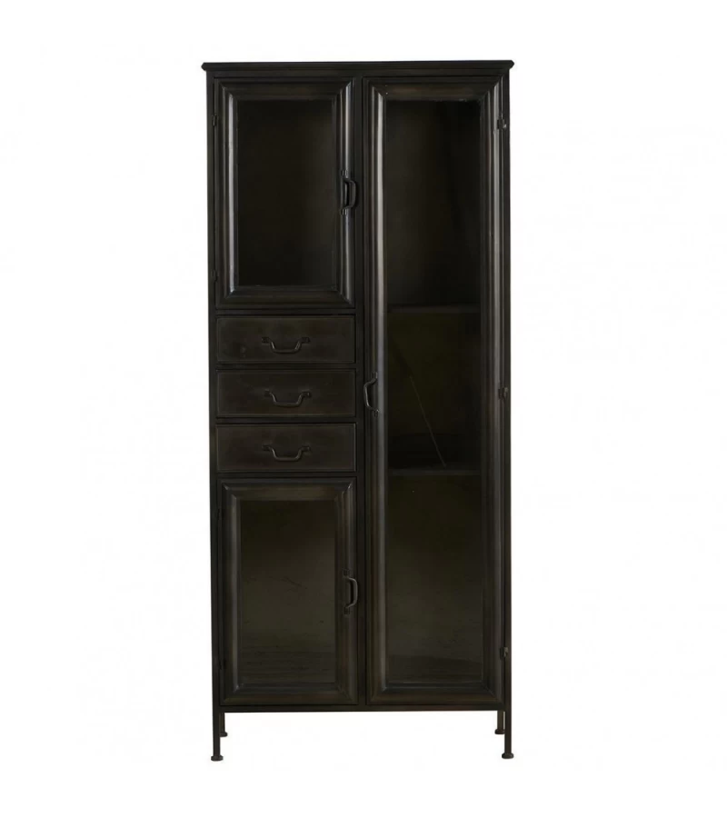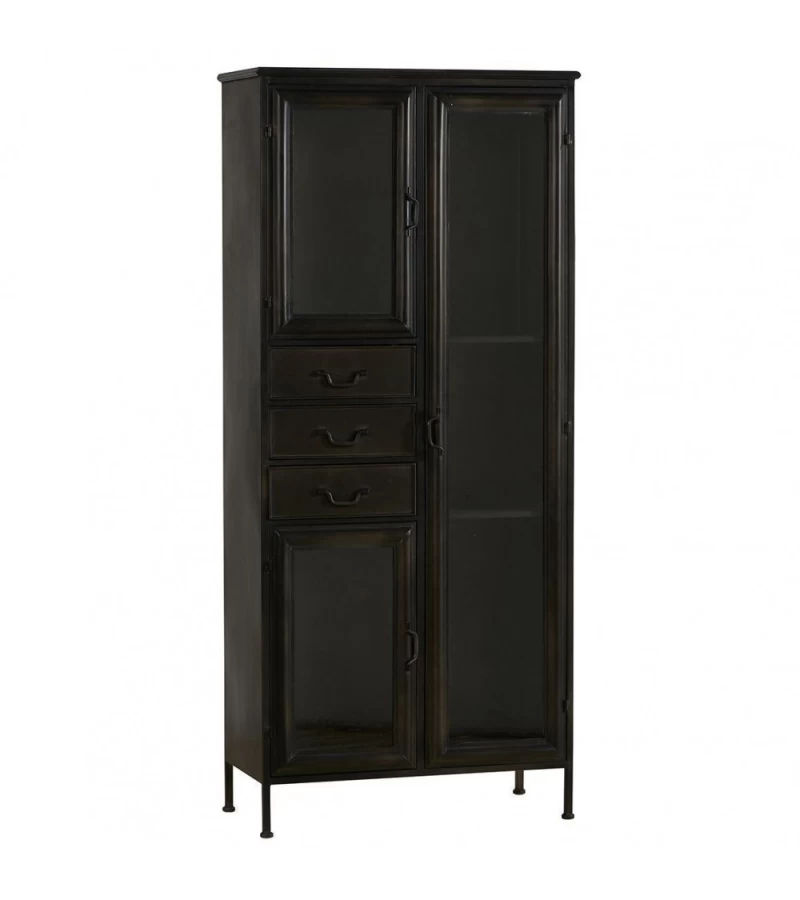 Réalisée en métal noir vieilli et habillée de 3 portes vitrées ainsi que de 3 tiroirs.