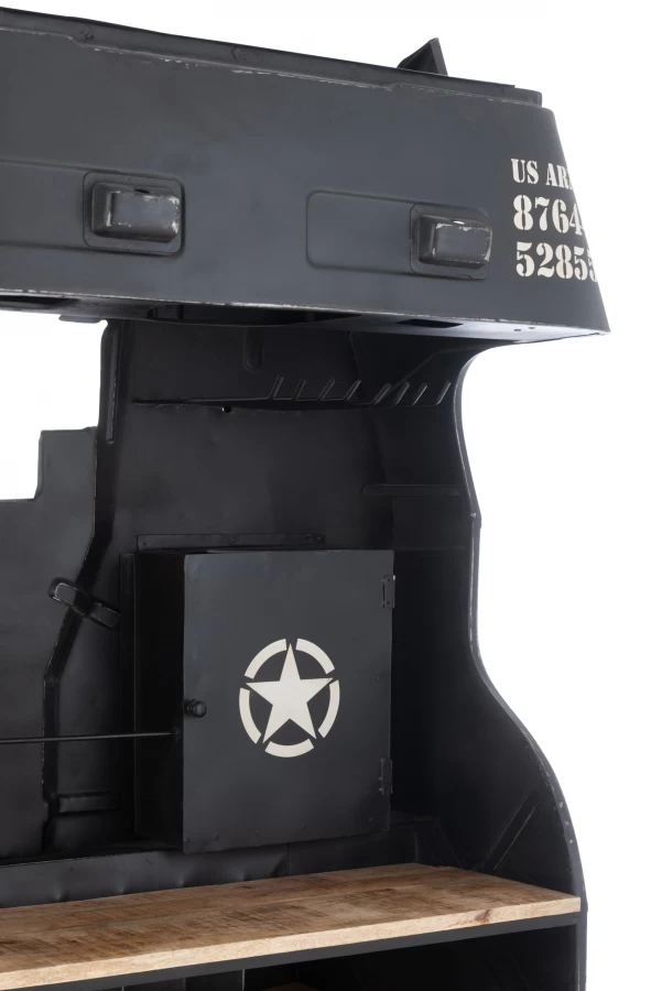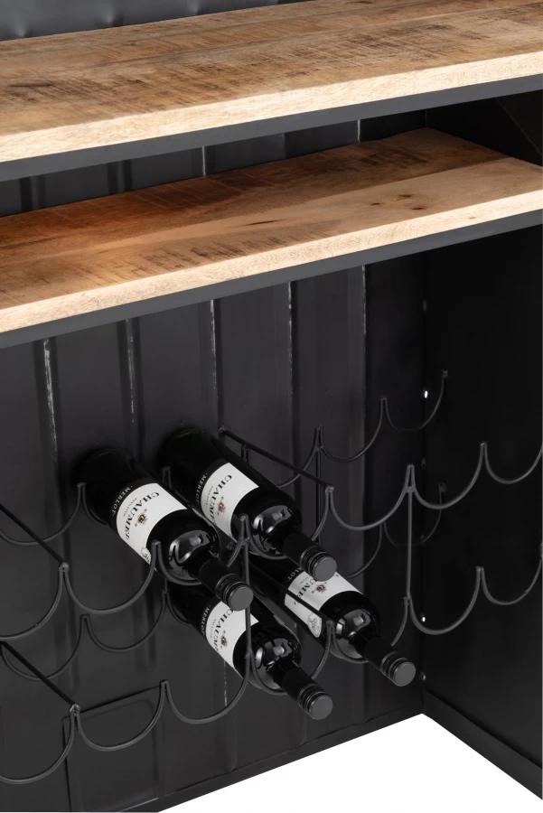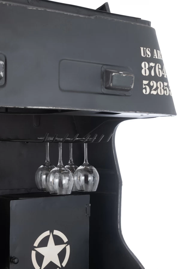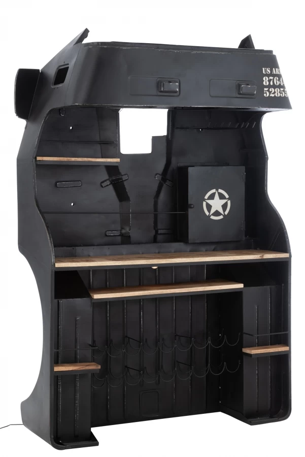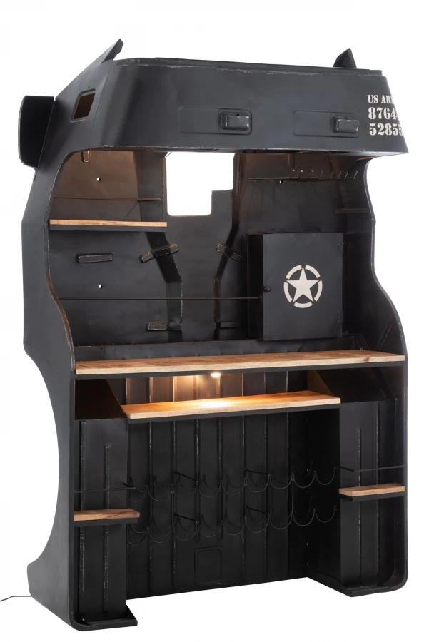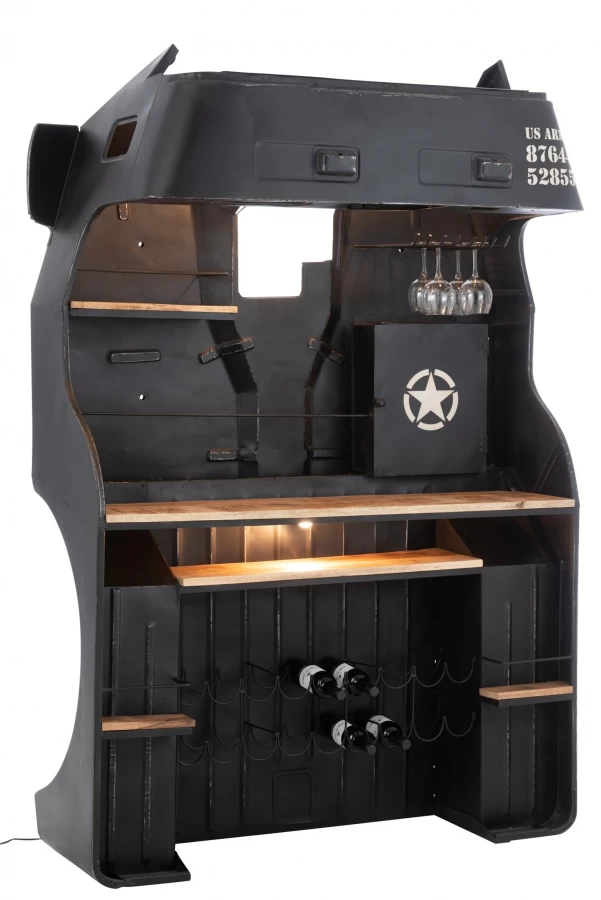 Voici le bar camion dans une déco indus ou contemporaine. Ce bar propose une partie comptoir ou plan de travail, 4 étagères en bois naturel, des casiers pour les bouteuilles, des suspensions pour les verres à pieds, 1 boite de rangement.