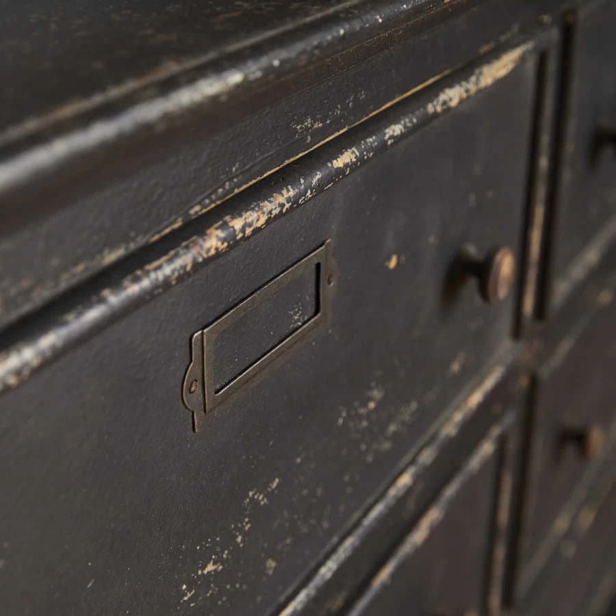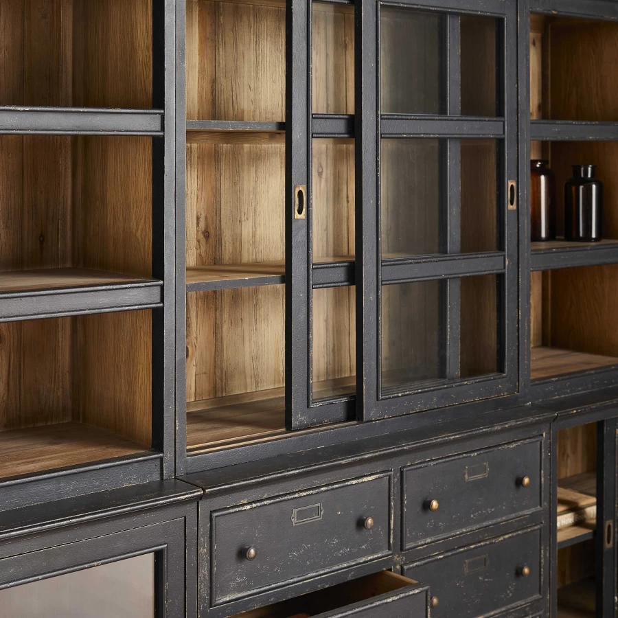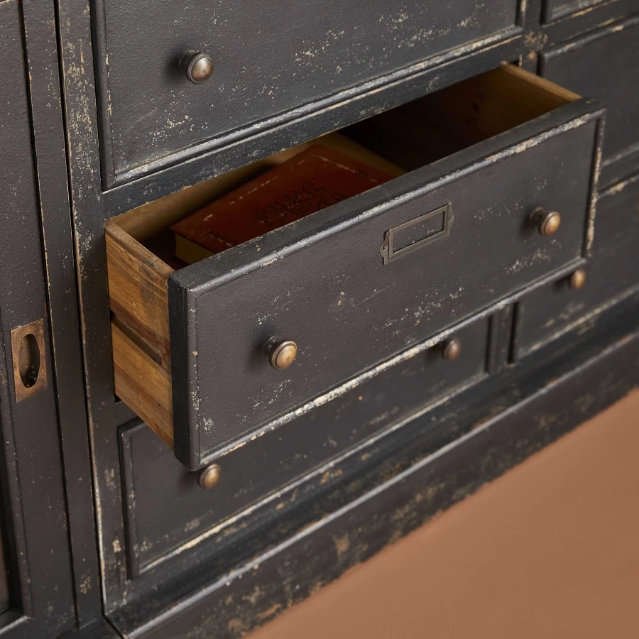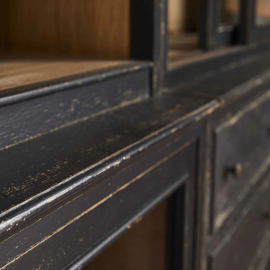 Cette grande bibliothèque est composée de 2 parties basses vitrées sur les extrémités, et 1 partie centrale habillée de 6 tiroirs.