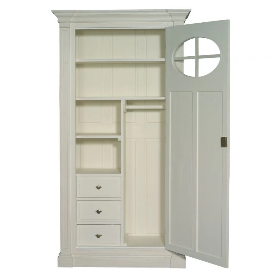 Cette bonnetière propose 1 porte habillée d’une lucarne et ouvrant sur 3 tiroirs, 2 petites étagères, 2 grandes étagères et 1 petite penderie.