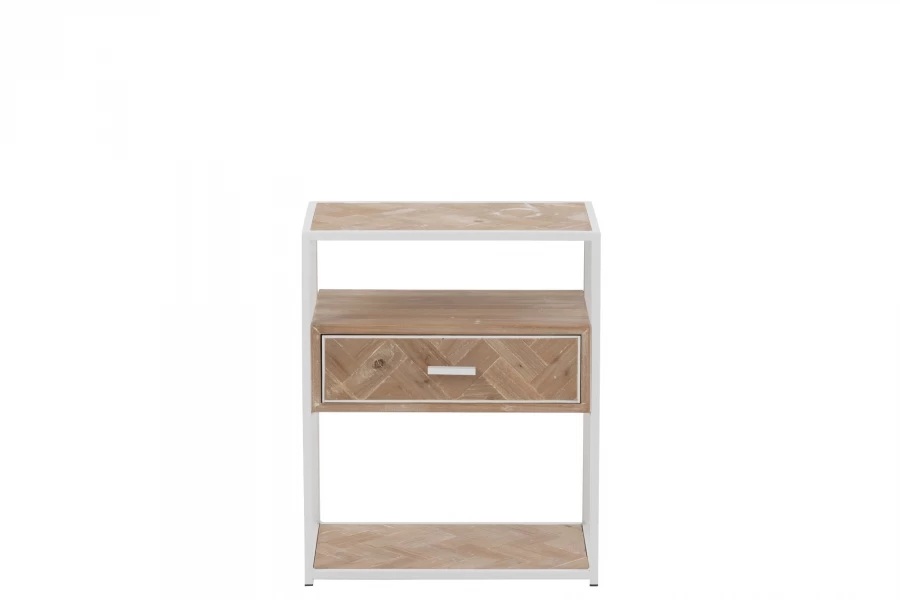 1 tiroir bois avec poignées métal, 1 étagère haute et 1 étagère basse.