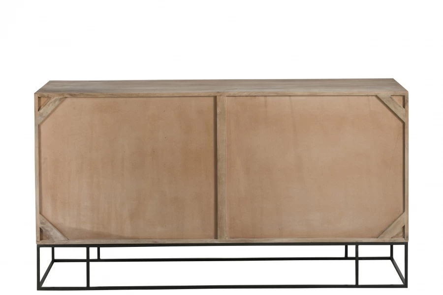 Joli buffet bas en bois naturel sur empiètement métal noir. Ce buffet fermé par 3 portes coulissantes ouvrent sur 1 étagère. L’originalité vient des portes habillées d’un tissage en rotin naturel. Ce buffet bas trouvera sa place dans un salon, une salle de bain ou une cuisine.