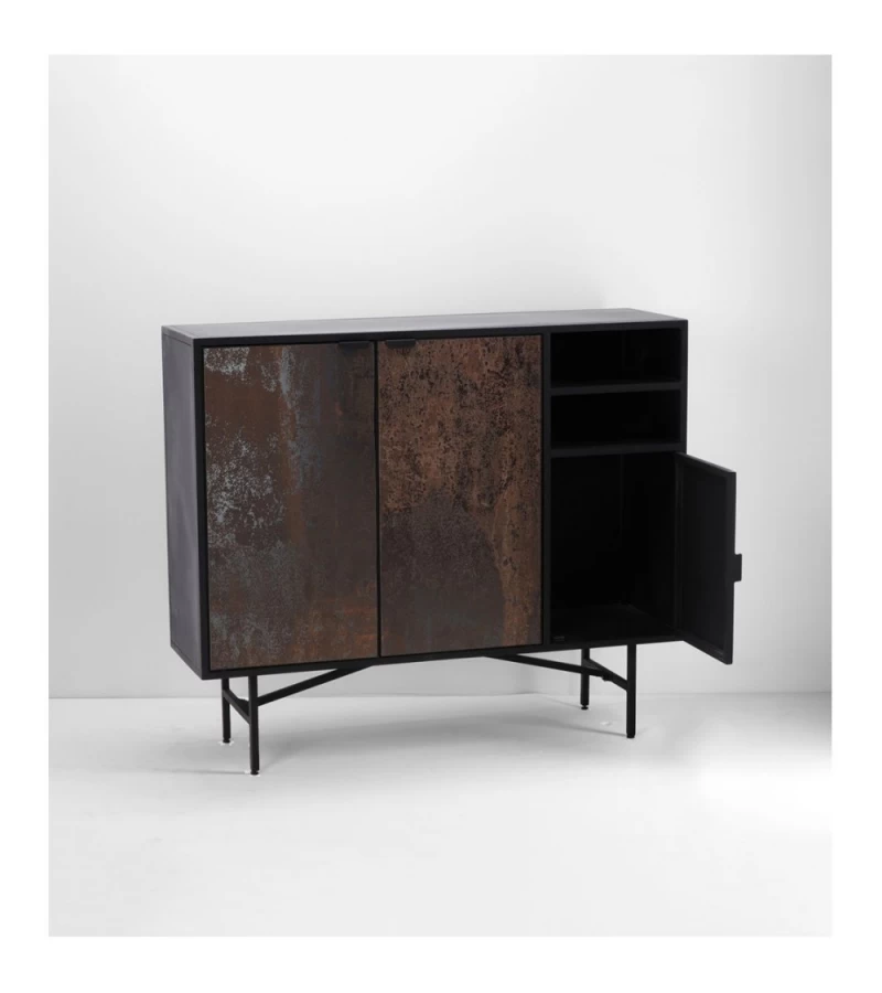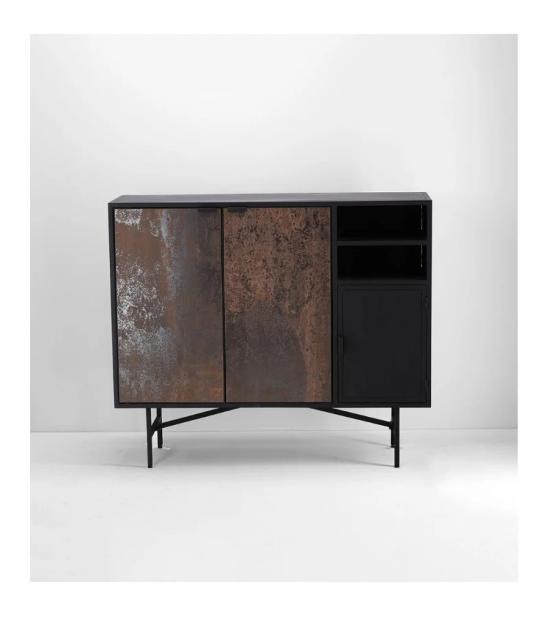 Nouveau buffet bas 3 portes avec piètement et structure en métal noir de la collection Rusty. L’ensemble est habillé de 2 portes en bois avec de jolis effets de teintes, brun et argent vieilli, 1 petite porte noire et de 2 niches.