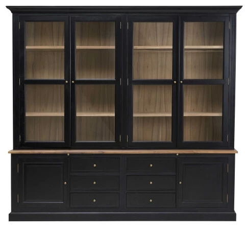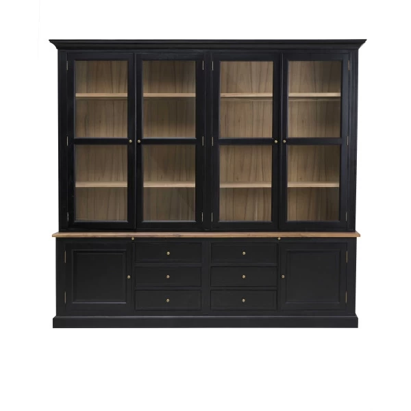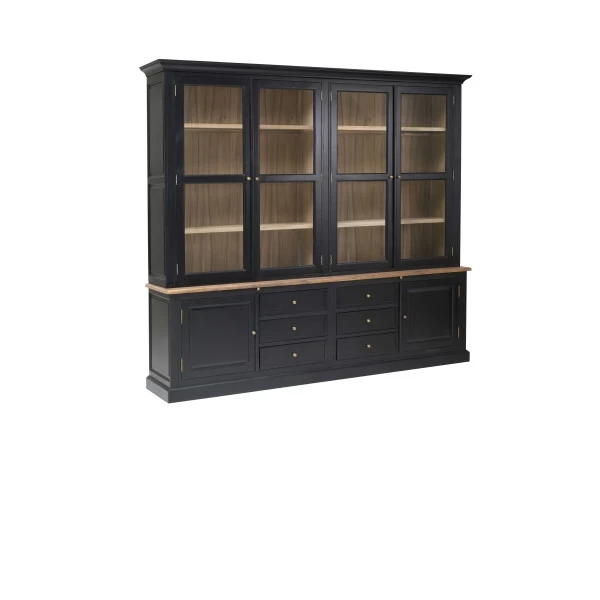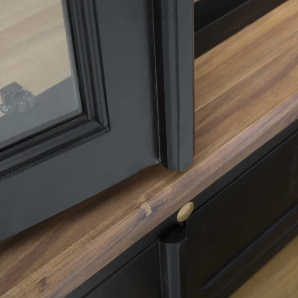 Buffet entièrement réalisé en bois d’acacia peint en noir sur les extérieur et naturel pour les intérieurs.