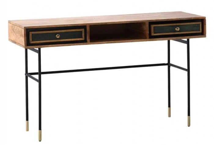 Burerau très original et chic bas en bois naturel et empiètement métal noir. et doré sur les extrémités. L’originalité est dans la teinte choisie pour la finition extérieur des 2 tiroirs, vert tâcheté ! le bois naturel reste très brut. Un niche au centre est également proposée.