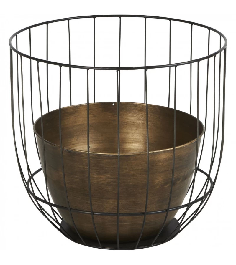 Joli cache-pot tout en métal de couleur bronze habillé d’un entourage grillagé noir.