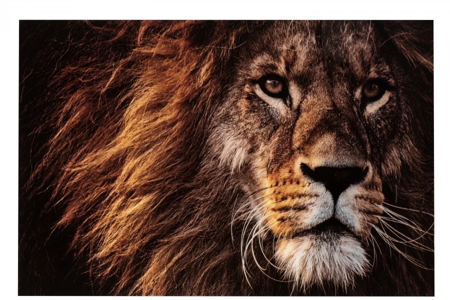 Sublime photo du roi des animaux aux couleurs très lumineuses. De très grande taille ce cadre mural sous verre trempé sera une pièce maitresse de votre décoration intérieure.