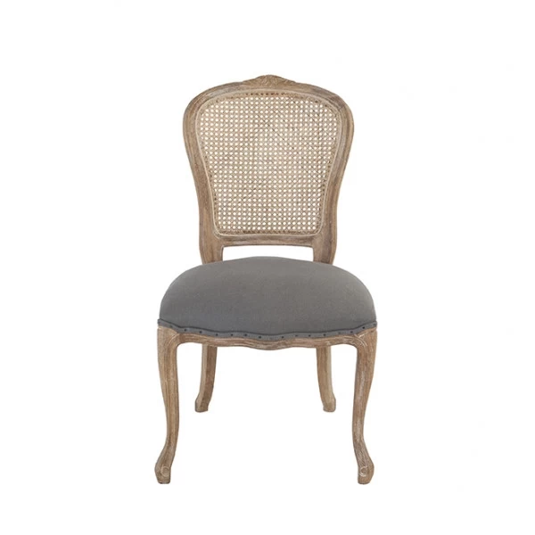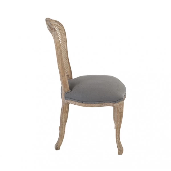 Très jolie chaise de style Louis XV réalisée avec un piètement 4 pieds tournés en chêne massif, habillé d’un tissu en jute de couleur grise et d’un dossier en cannage naturel.