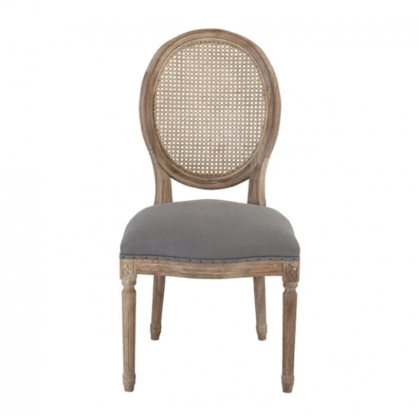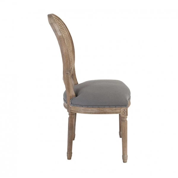 Réalisée avec un piètement 4 pieds en chêne massif, habillé d’un tissu de couleur grise et un dossier en cannage naturel.
