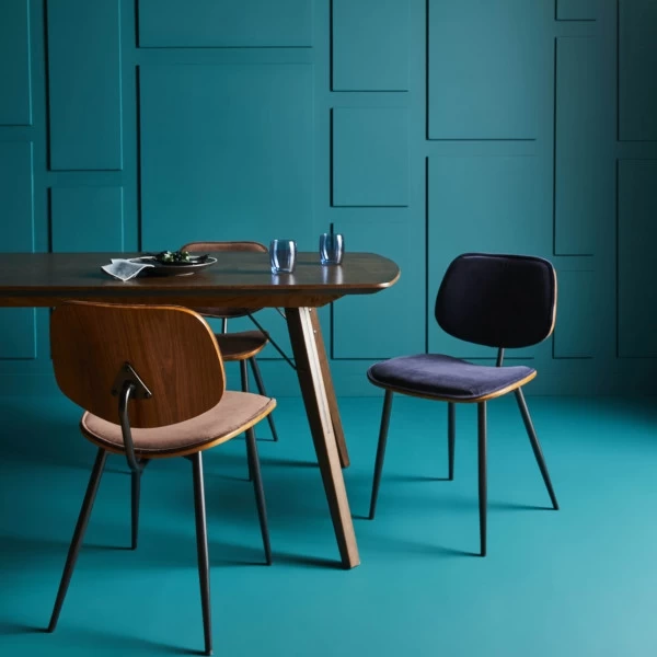 La chaise Olympia, de par son esthétisme simple et son revêtement 100% velours bleu et son placage teinté noyer, s’intégrera parfaitement à votre décoration intérieure.