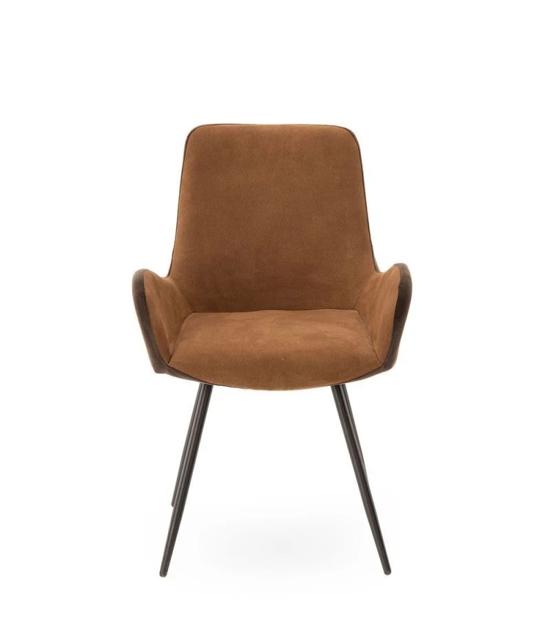 Magnique nouvelle chaise de la collection Rizzo réalisée en tissu velours 2 tons. L’empiètement est en métal noir. Chaise joliment travaillée avec une structure en peuplier, et des formes épousant bien le corps.