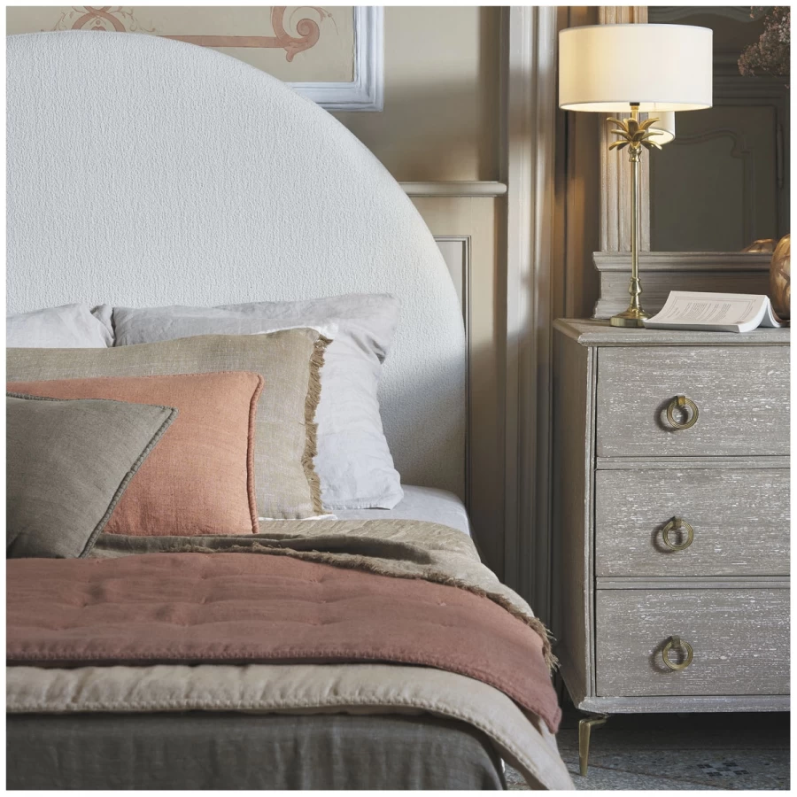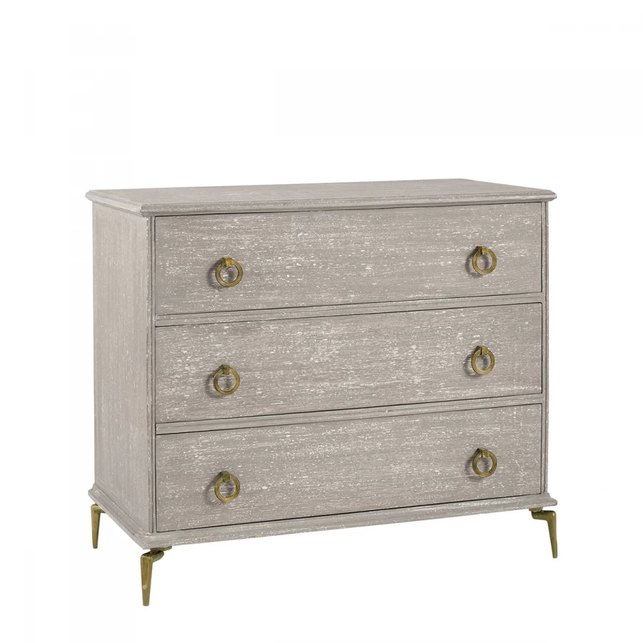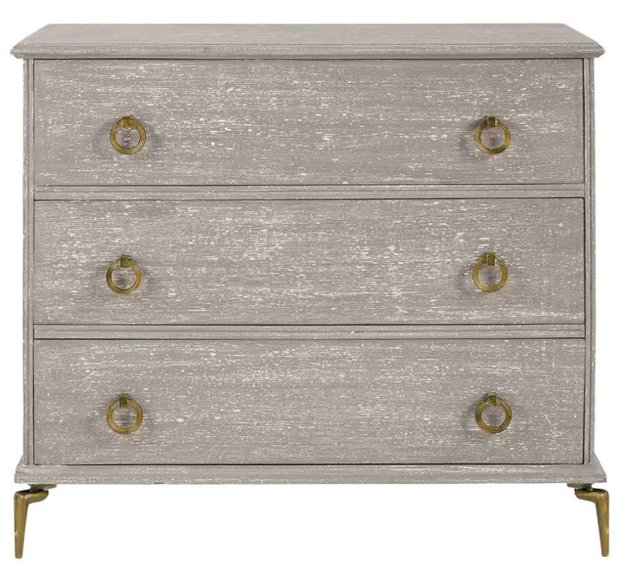 Entièrement réalisées à la main, les courbes classiques de la commode GABRIELLE en manguier sont sublimées par une patine grise artisanale et les touches de laiton lumineuses de ses pieds et poignées.
