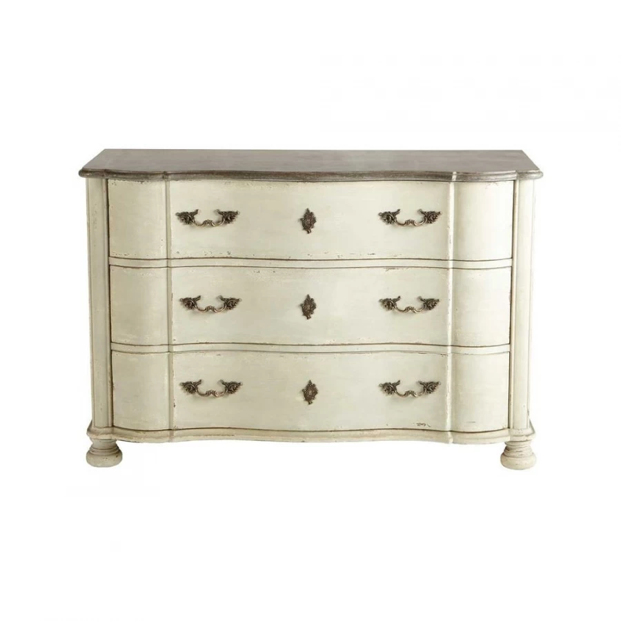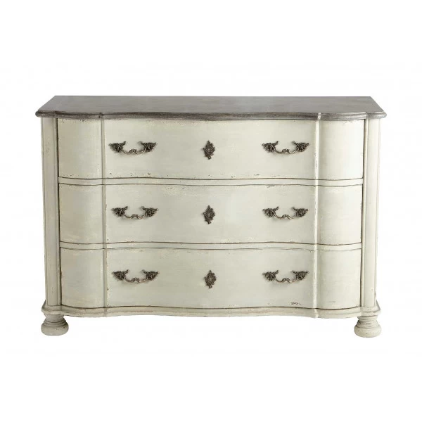 Magnifique commode réalisée en pin massif patiné écru vieilli et proposant 3 grands tiroirs avec poignées stylisées mordorées.