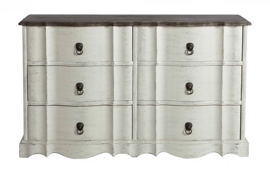 Magnifique commode double réalisée en pin massif patiné propose 6 tiroirs avec poignées anneaux mordorés.