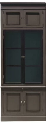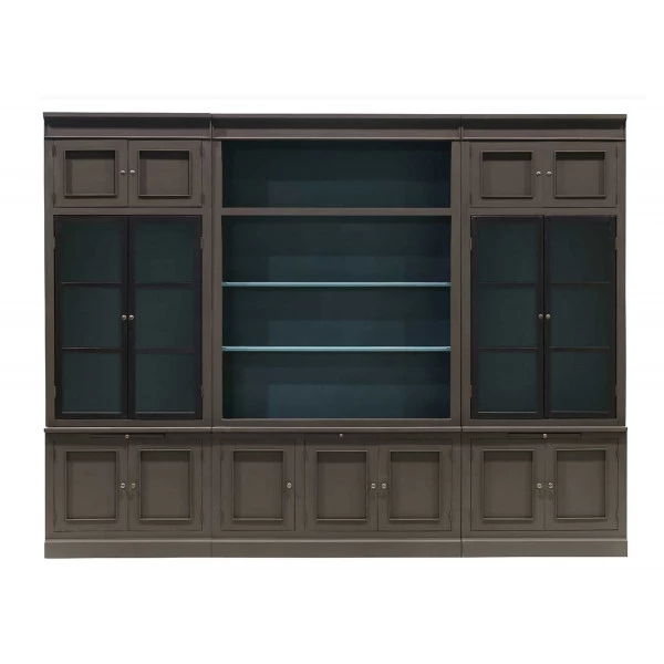Sur cette photo d’ensemble la bibliothèque est présentée avec 3 modules. 2 modules avec portes vitrées et un module central ouvert avec étagères.