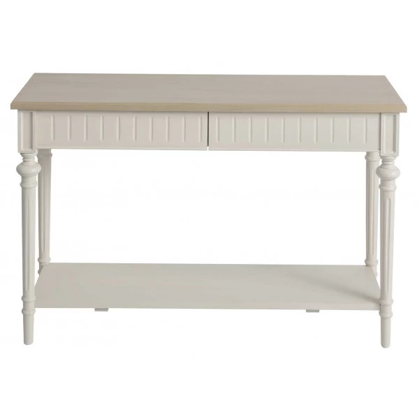 Jolie console de style inspiration charme Campagne Chic entièrement réalisée en pin massif patiné offrant 2 tiroirs. Cette console est habillé d’un plateau en chêne naturel et propose une étagère basse.
