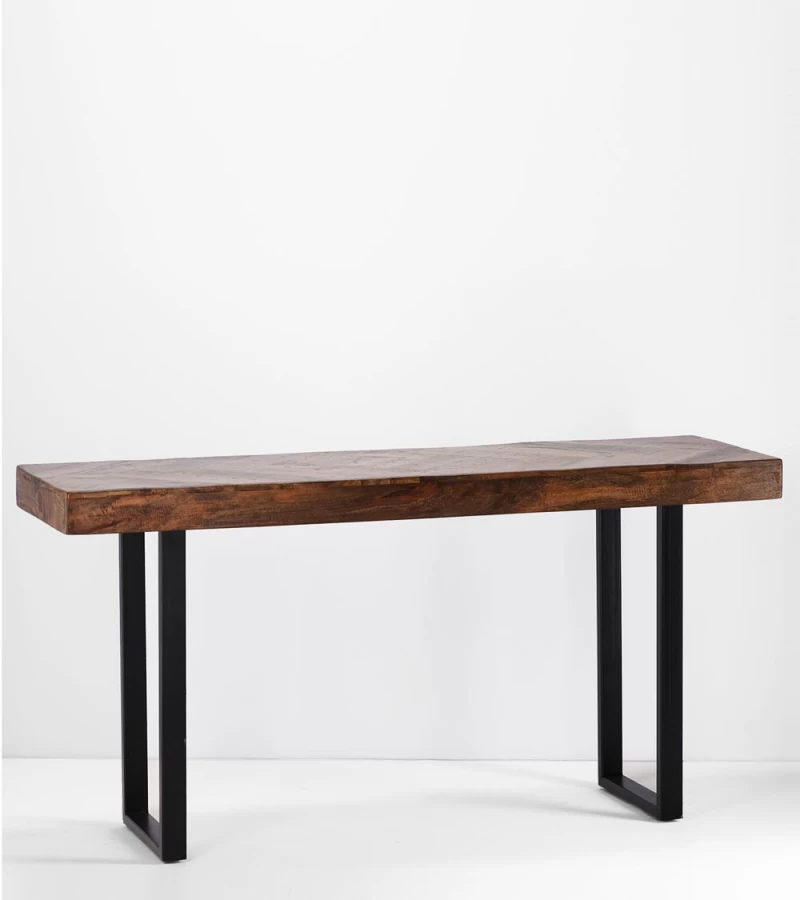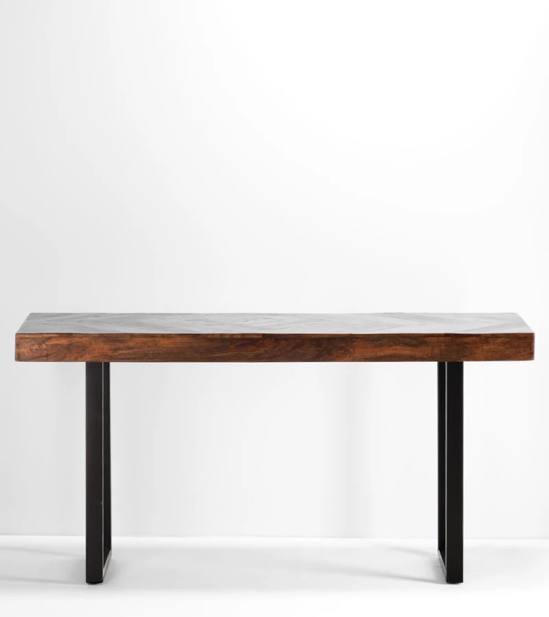 Nouvelle très belle console en bois vernis avec empiètement rigide métal noir. De belles dimensions, cette console se mariera parfaitement dans un intérieur Indus, Montagnard, Campagne mais ausi un intérieur très chic et cosy.