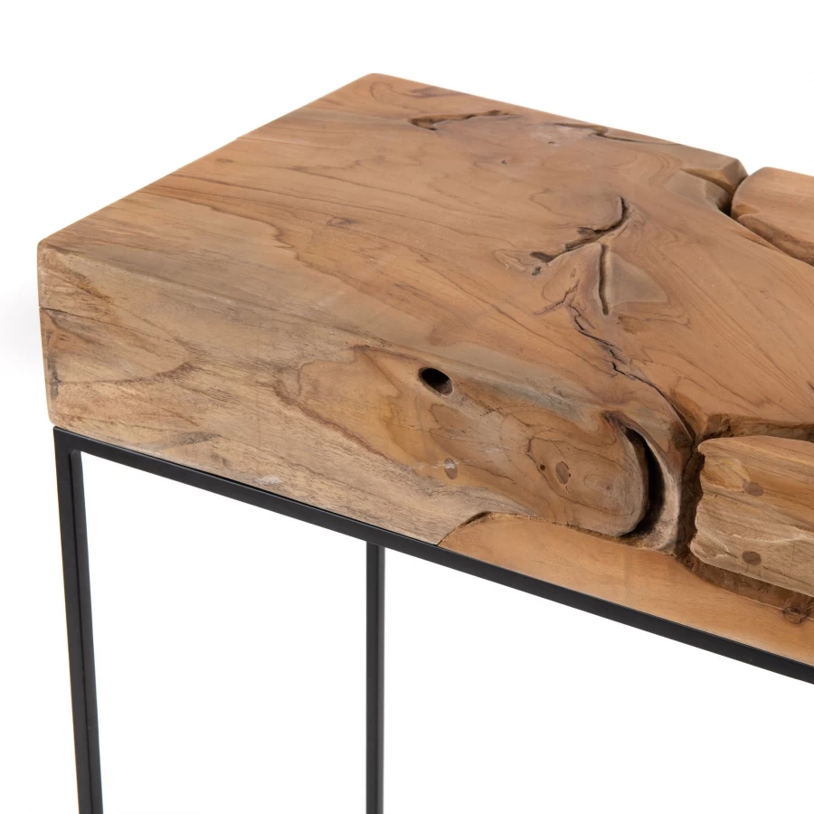 Cette console est réalisée avec un piètement fin en métal noir et habillé d’un plateau très épais en tack nrut naturel.