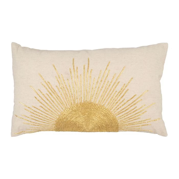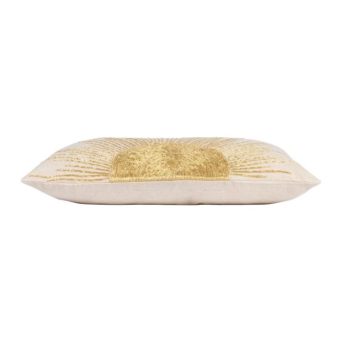 La collection Soleil propose ce coussin rectangulaire entièrement réalisé en lin et brodé d’un magnifique soleil en fil de coton doré.