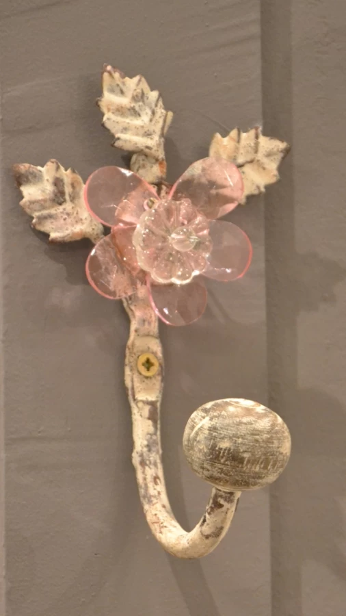 Pour un style Shabby Chic dans votre intérieur voici l’article indispensable pour la touche finale. Le crochet Orfèvre en métal patiné blanchi et orné d’un fleur en verre de couleur rose. Idéal pour suspendre les torchons ou serviettes.