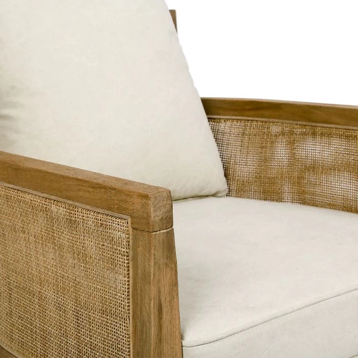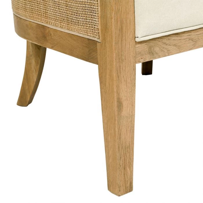Très bel assemblage de chêne et rotin pour l’empiètement, le tout habillé en lin couleur sable.