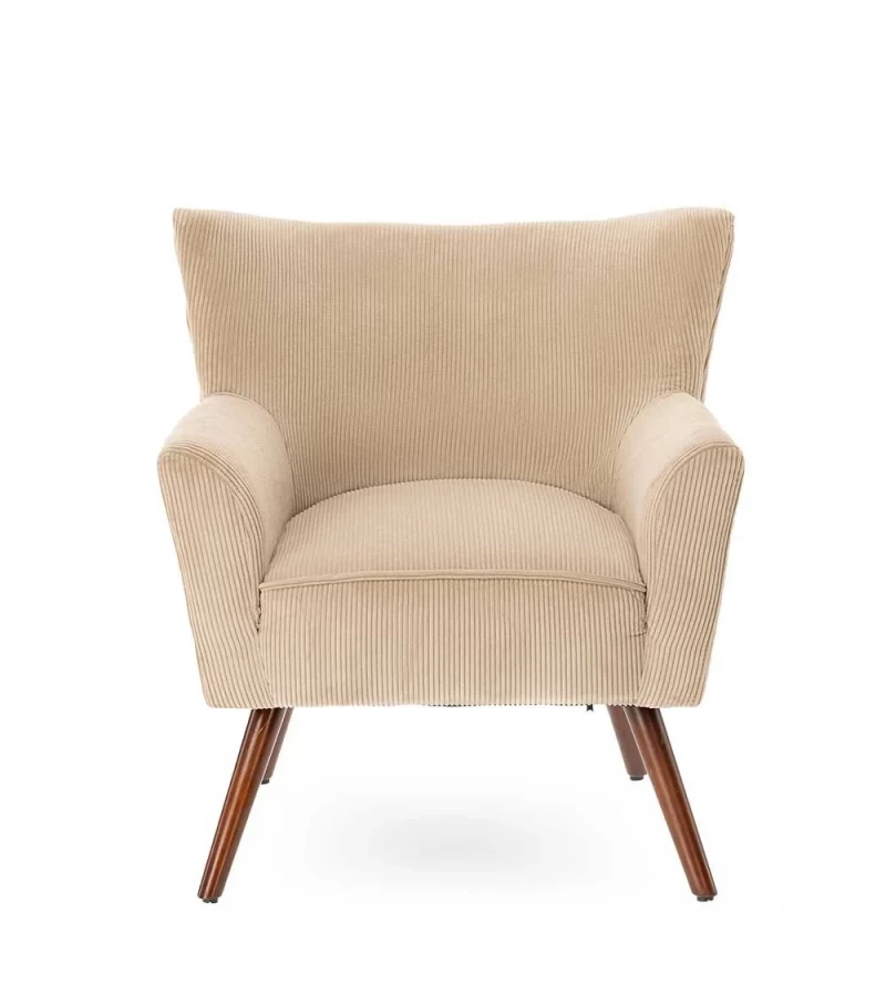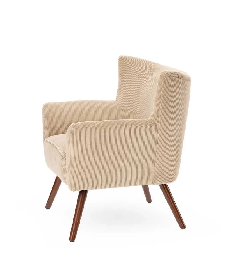 Très joli fauteuil confortable et très tendance habillé de tissu velours côtelé. Ce Fauteuil est posé sur 4 pieds en bois vernis marron.