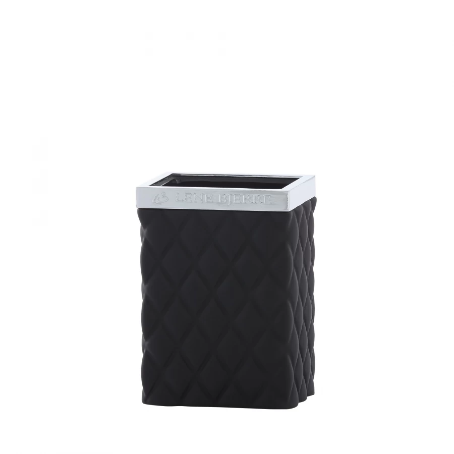 Gobelet en céramique de couleur noir mat à motif arlequin avec plateau argenté.