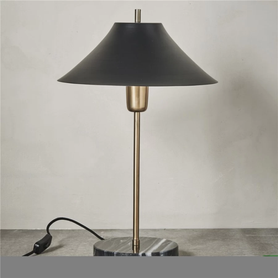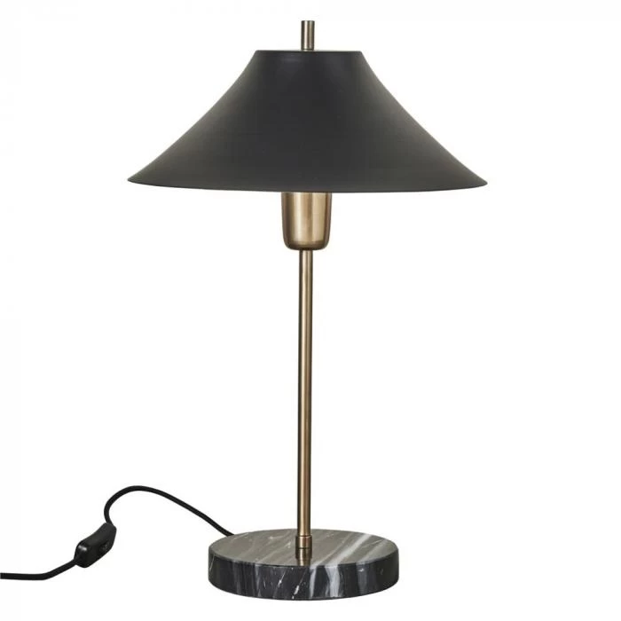 La lampe Sofia est réalisée en métal or clair sur un socle rond en marbre noir.