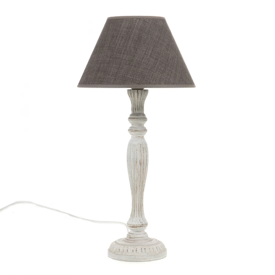Lampe très élégante réalisée avec un pied bois joliment travaillé et patiné blanc. Ce pied est habillé d’un abat-jour rond en tissu polyester gris.