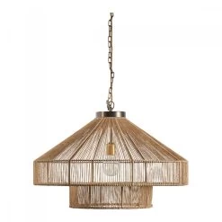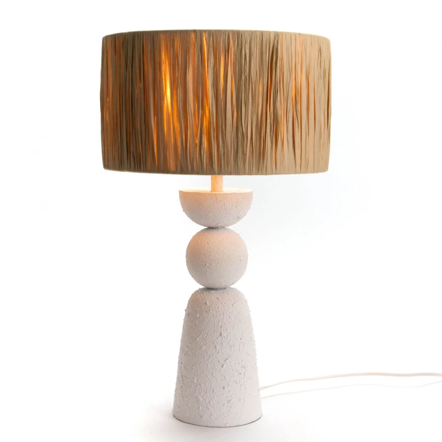Style bohème chic très tendance avec cette lampe en métal blanc habillée d’un abat-jour rond en fibre végétale naturelle.