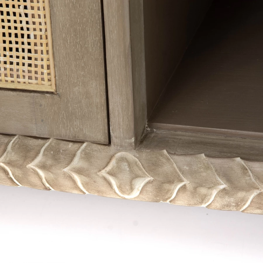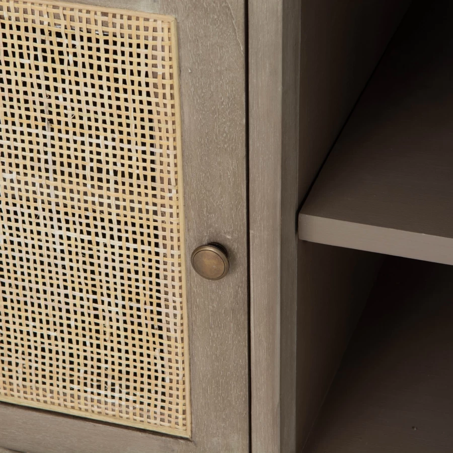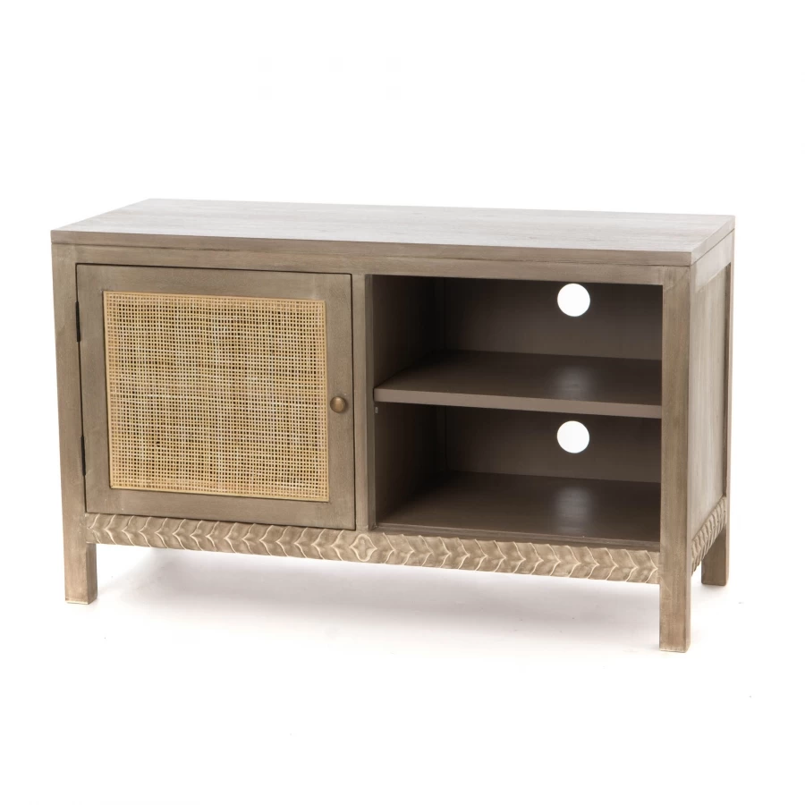 Petit meuble TV de la collection Inspiration réalisé entièrement en bois avec une porte en cannage de rotin naturel.