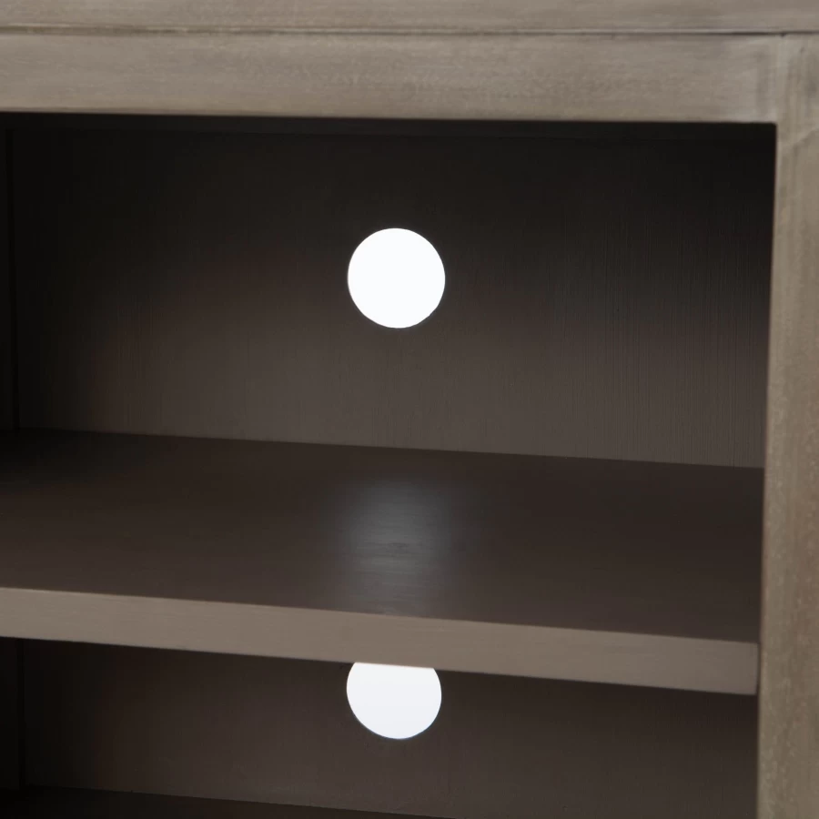 La porte ouvre sur 1 étagère. Les 2 niches sont pré-percées pour le cablage de vos appareils audio.