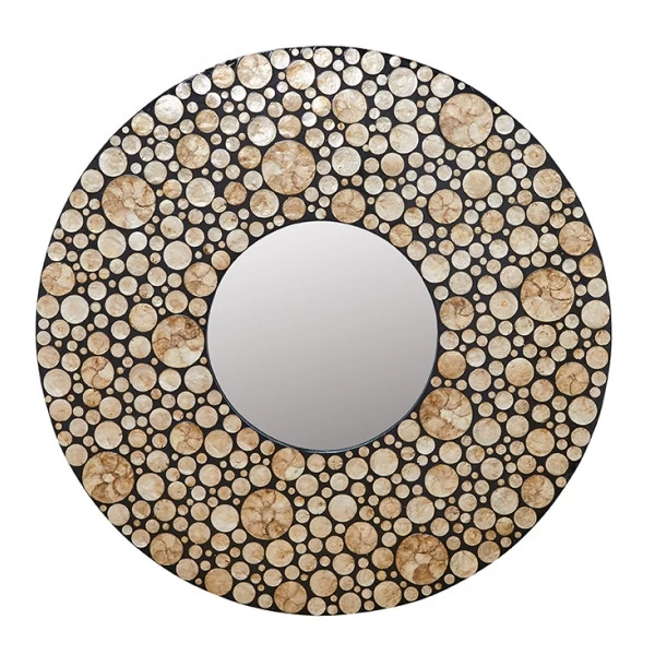 Ce miroir est réalisé avec une structure en résine et un habillage décoratif en cercles de nacre.