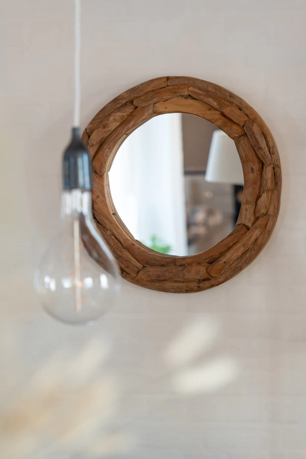 Très tendance miroir rond en teck naturel, facilement logeable dans toutes les pièces de la maison.