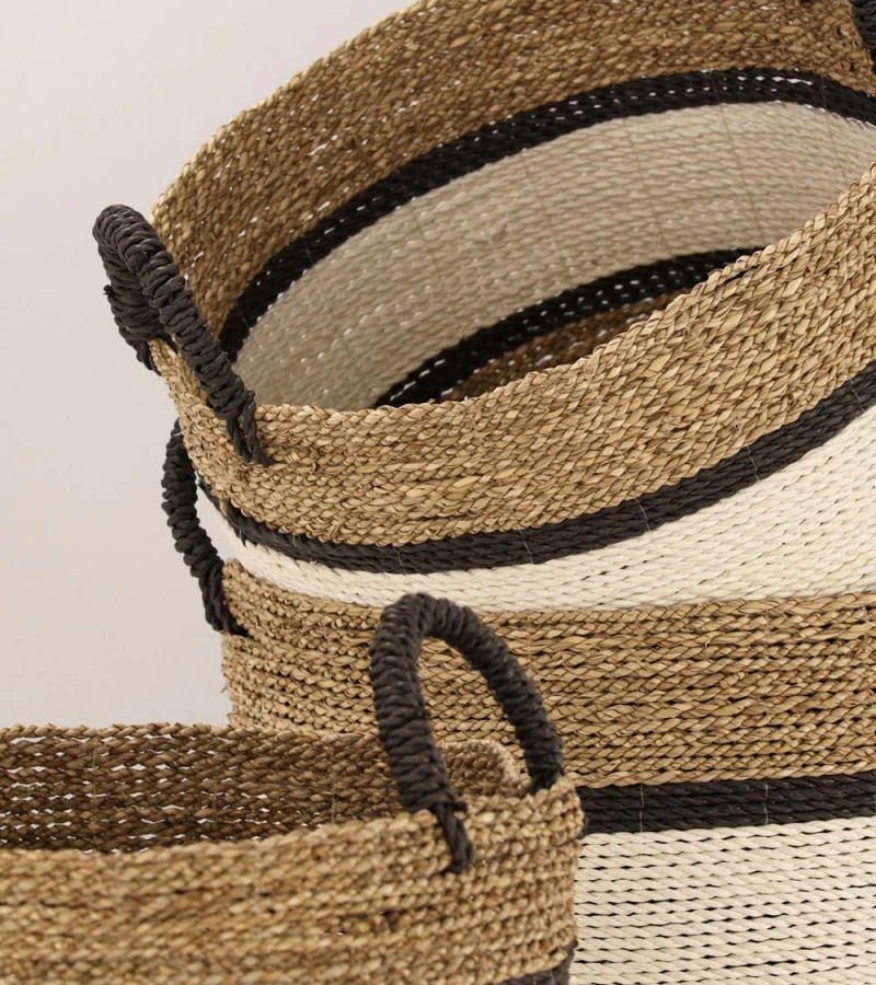 Set de 3 jolis paniers ronds en raphia et herbes marines avec poignées assorties. Belle finition dans les tons naturels. Pour le rangement dans la salle de bain, la chambre ou le salon…