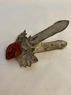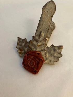 Cette pince est réalisée en métal blanc rouille et habillée d’une petite rose ruban en tissu.