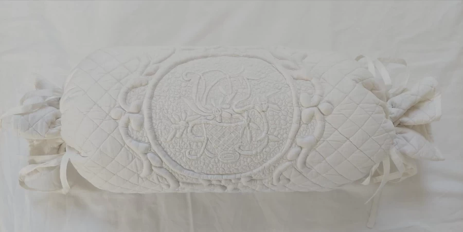 Le modèle de la collection Bastide blanc est magnifiquement habillé d’un joli monogramme en son centre sur une finition d’ensemble esprit boutis.