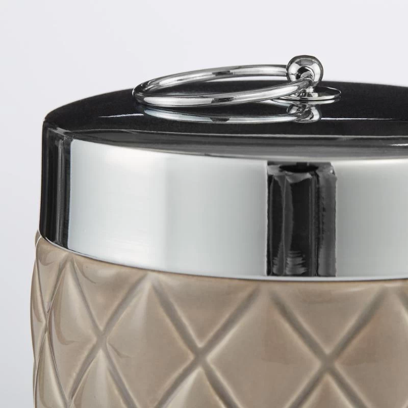 Pot en céramique de couleur marron exclusif avec un design arlequin et un couvercle argenté en alliage de zinc.