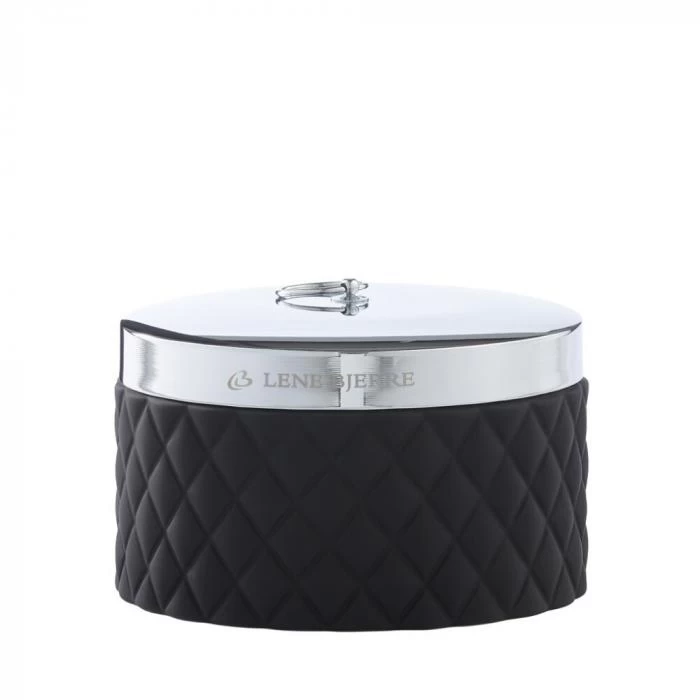 Pot en céramique bas de couleur noir mat exclusif avec un design arlequin et un couvercle argenté en alliage de zinc.