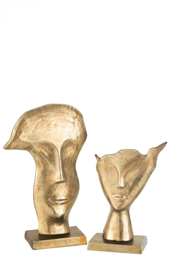 Nouvelle statuette de visage très tendance en décoration intérieure. Tel un masque faconné à la Picasso, cet objet est réalisé en métal doré.