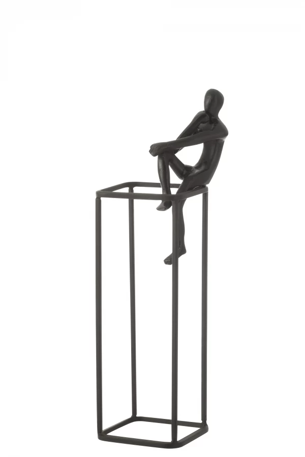 Personnage assis perdu dans ses pensées, sur un cube en aluminium de couleur noire.