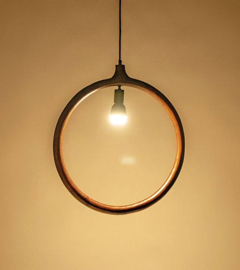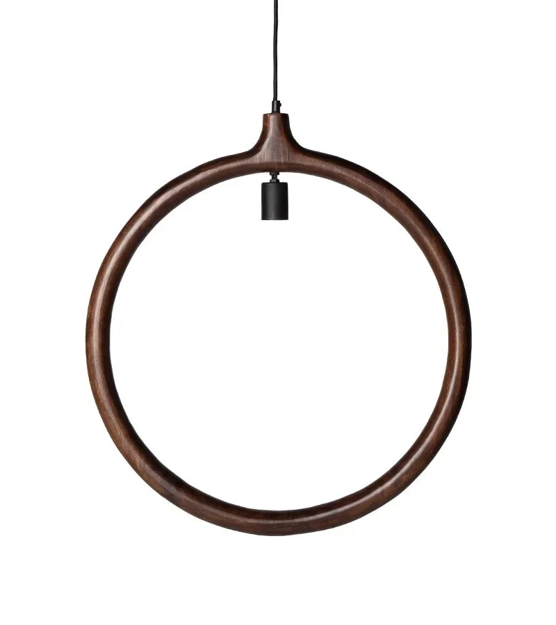 Nouvelle collection de suspension de style contemporain avec cette suspension cercle réalisée en bois de Noyer.